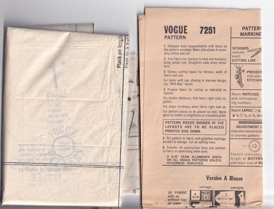Vogue 7251 Womens Blouse in 3 Versions 1960s Vintage Sewing Pattern Size 8 Bust 31.5 inches