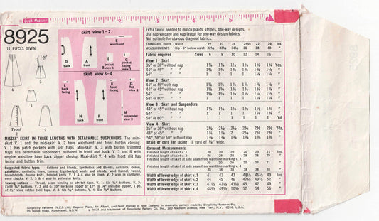 Simplicity 8925 Womens Maxi Midi High Waisted Suspender Skirts 1970s Vintage Sewing Pattern Size 12 Bust 34 Inches