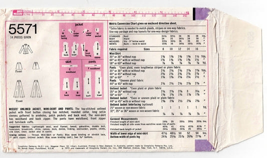 Simplicity 5571 Womens Wide Lapel Jacket Mini Skirt & Bell Bottom Pants 1970s Vintage Sewing Pattern Size 8 Bust 31.5 Inches UNCUT Factory Folded