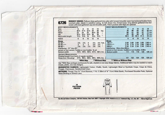 McCall's 6726 Womens CAROLE LITTLE Gathered Shoulder Shirtdress 1970s Vintage Sewing Pattern Size 14 UNCUT Factory Folded