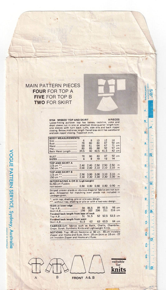Very Easy Vogue 9154 Womens Yoked Top & Skirt 1970s Vintage Sewing Pattern Size 10 Bust 32 1/2 inches UNCUT Factory Folded
