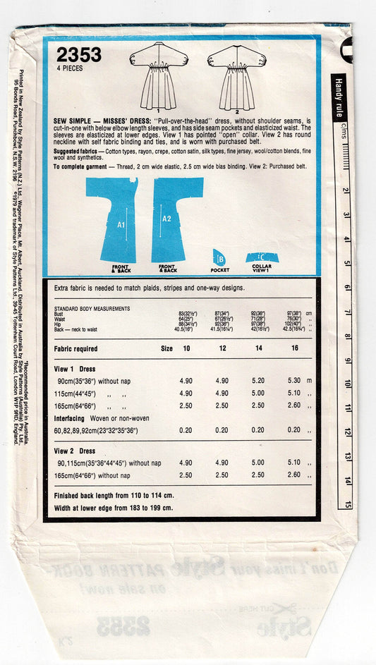 Style 2353 Womens EASY Kimono Sleeved Pullover Dress 1970s Vintage Sewing Pattern Size 16 Bust 38 Inches