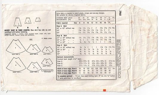 Style 2968 Womens Bias Cut Skirts or Tennis Skirt in 3 Lengths 1970s Vintage Sewing Pattern Size 12 Waist 25.5 Inches