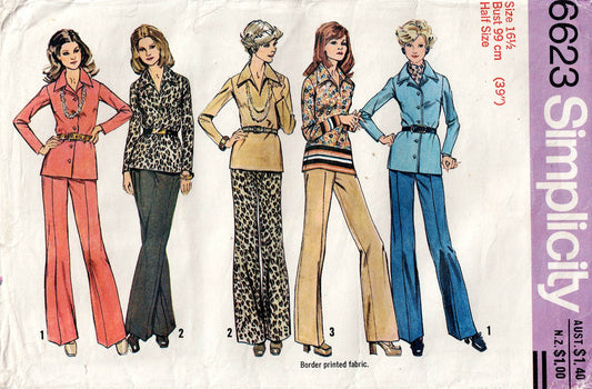 Simplicity 6623 Womens Half Sized Pullover Wide Collar Shirt & Pull On Pants 1970s Vintage Sewing Pattern Size 16 1/2 Bust 39 inches