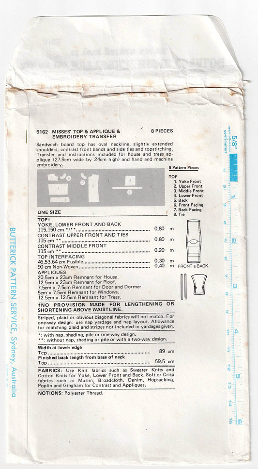 Butterick 5162 Womens Tie On Applique Top with Embroidery Transfers 1970s Vintage Sewing Pattern ONE SIZE UNCUT Factory Folded