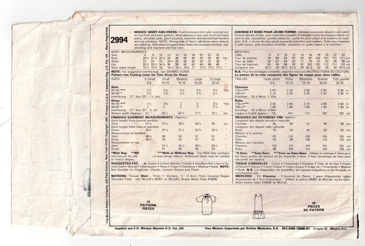 McCall's 2994 Womens Shirt & Dropped Waist Dress 1980s Vintage Sewing Pattern Size 18 - 20 UNCUT Factory Folded