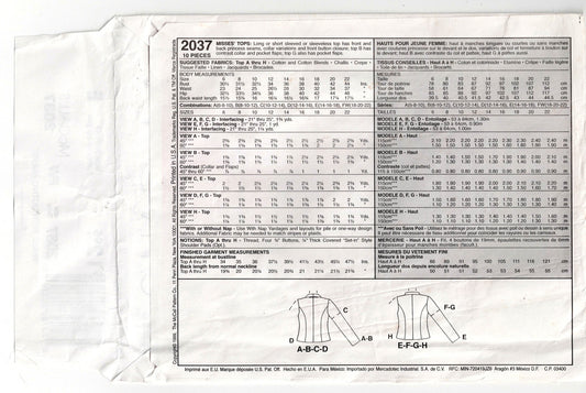 McCall's 2034 Womens Princess Tops 1990s Vintage Sewing Pattern Sizes 18 - 22 UNCUT Factory Folded