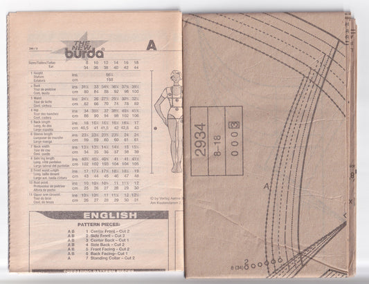 Burda 2934 Womens EASY Princess Blouse 1990s Vintage Sewing Pattern Sizes 8 - 18 UNCUT Factory Folded