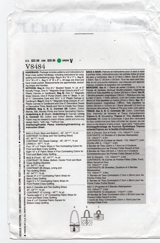 Vogue V8484 Womens B RANDLE Crazy Quilted Handbags Out Of Print Sewing Pattern UNCUT Factory Folded