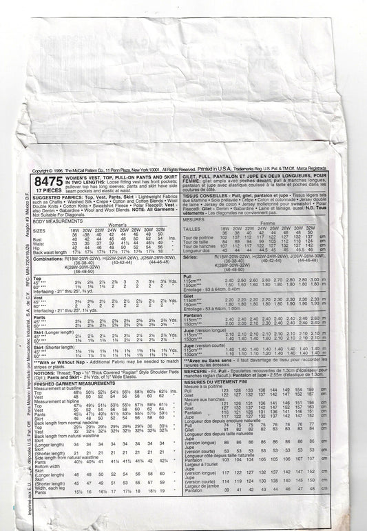 McCall's 8475 Womens EASY Vest Top Skirt & Pants 1990s Sewing Pattern Size 18 W - 22 W UNCUT Factory Folded