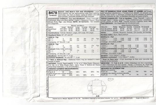 McCall's 8478 Womens Mens UNISEX Polar Fleece Pullover Sweatshirts & Headband 1990s Vintage Sewing Pattern Sizes XL & XXL UNCUT Factory Folded