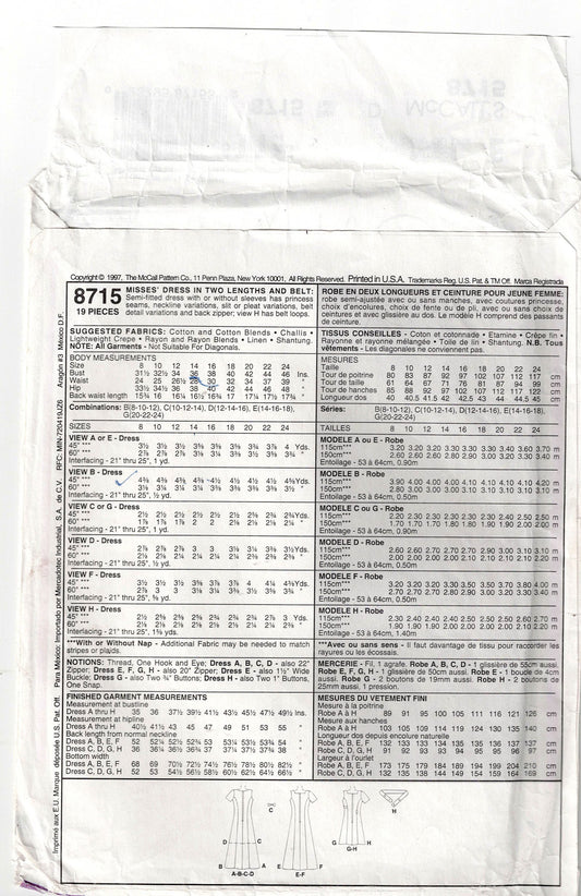 McCall's 8715 Womens Classic Princess Dress 1990s Vintage Sewing Pattern Size 12 - 16 UNCUT Factory Folded
