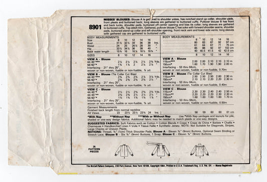 McCall's 8901 LIZ CLAIBORNE Womens High Neck Full Sleeved Pussy Bow Blouses 1980s Vintage Sewing Pattern Size 12 or 14 UNCUT Factory Folded