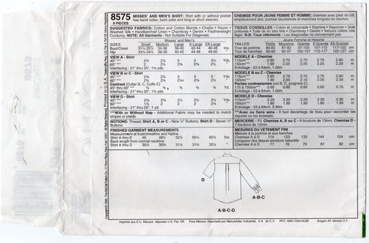 McCall's 8578 Mens Womens Unisex Button Down Shirts 1990s Vintage Sewing Pattern Size MEDIUM Bust/Chest 34 - 36 inches UNCUT Factory Folded