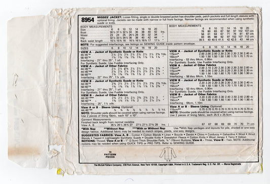 McCall's 8954 PALMER PLETSCH Womens Easy Fit Jacket 1980s Vintage Sewing Pattern Size 8 Bust 31.5 inches UNCUT Factory Folded
