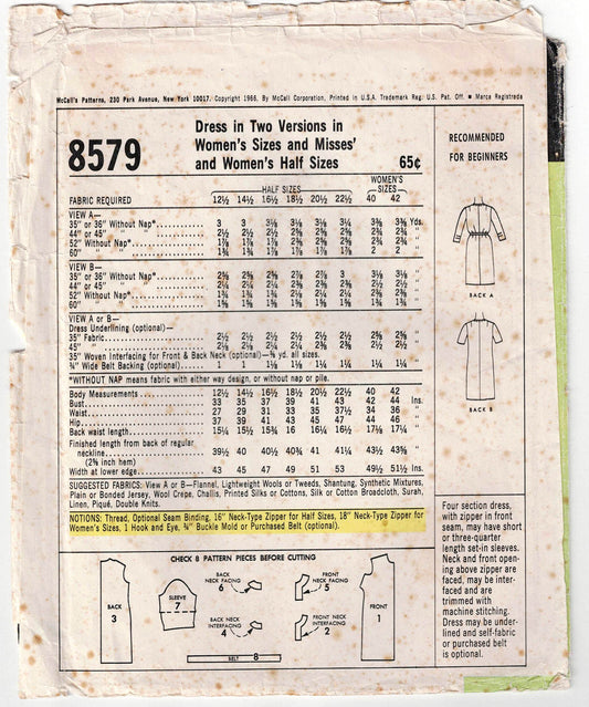 McCall's 8579 Womens EASY Half Sized Shift Dress 1960s Vintage Sewing Pattern Bust 35 Inches