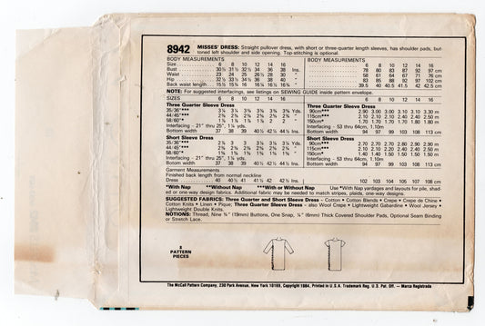 McCall's 8942 Womens EASY Side Buttoned Dress 1980s Vintage Sewing Pattern Size 10 UNCUT Factory Folded