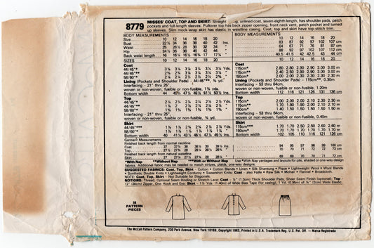 McCall's 8779 HELEN LEE Womens Coat Top & Mock Wrap Skirt 1980s Vintage Sewing Pattern Size 14 Bust 36 Inches UNCUT Factory Folded