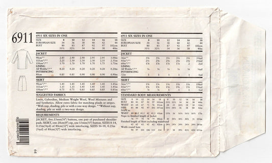 New Look 6911 Womens Below Hip Jacket with Stand Up Collar & Slim Skirt 1980s Vintage Sewing Pattern Sizes 8 - 18 UNCUT Factory Folded