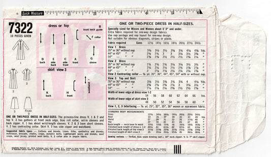 Simplicity 7322 Womens Half Size Roll Collar Dress Top & Skirt 1960s Vintage Sewing Pattern Size 14 1/2 Bust 35 inches