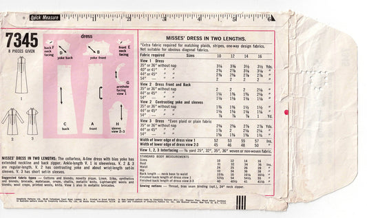 Simplicity 7345 Womens A Line Dress with Bias Yoke & Collar 1960s Vintage Sewing Pattern Size 14 Bust 34 inches