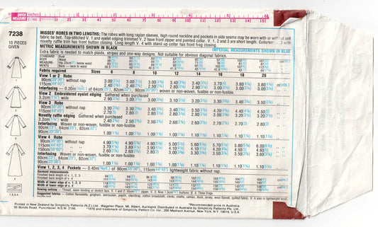 Simplicity 7238 Womens Zip Front Robe 1970s Vintage Sewing Pattern Size 10 or 18 & 20