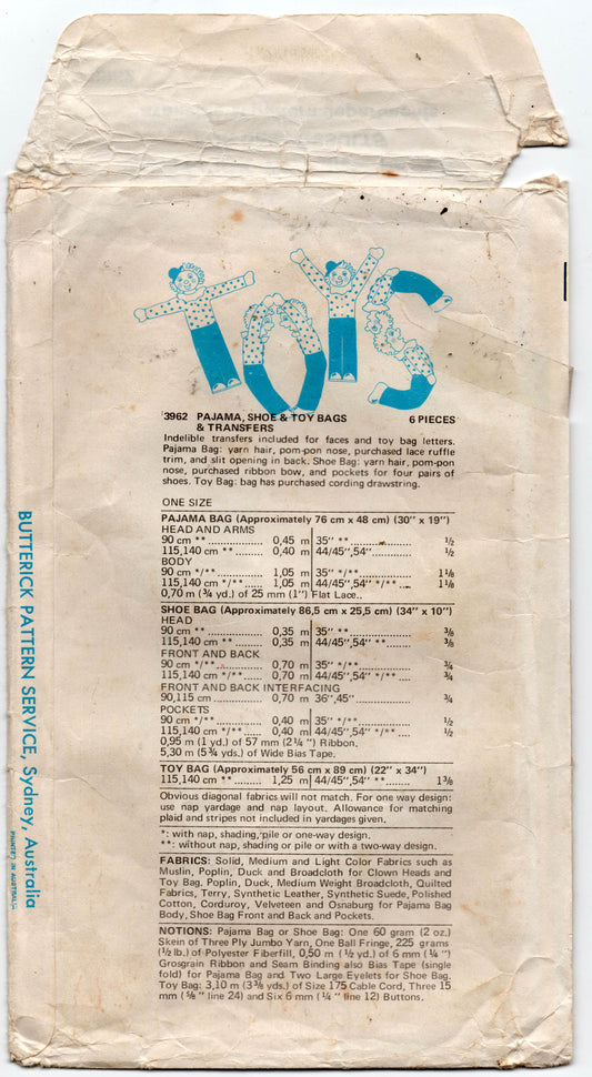 Butterick 3962 Kids Novelty Clown Pajama Shoe & Toy Bags with Iron On Face Transfers 1970s Vintage Sewing Pattern