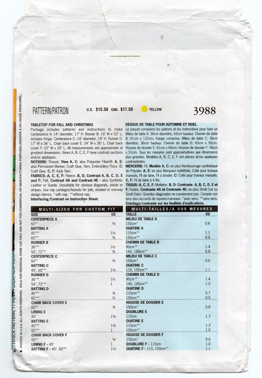 Butterick 3988 Christmas & Halloween Table Decorations Pumpkins Snowman Theme Out Of Print Craft Sewing Pattern UNCUT Factory Folded