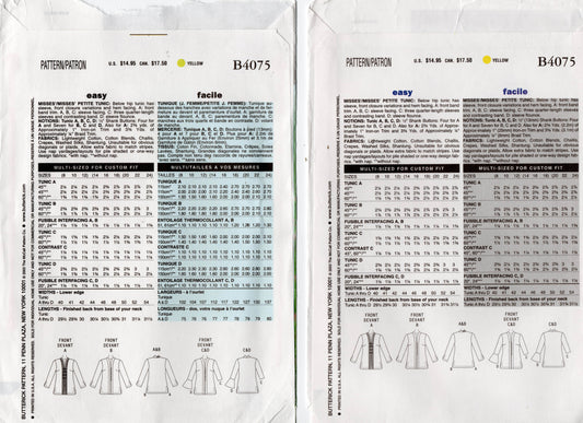 Butterick 4075 Womens Pullover Caftan Style Tunic Tops Out Of Print Sewing Pattern Size 8 - 12 UNCUT Factory Folded