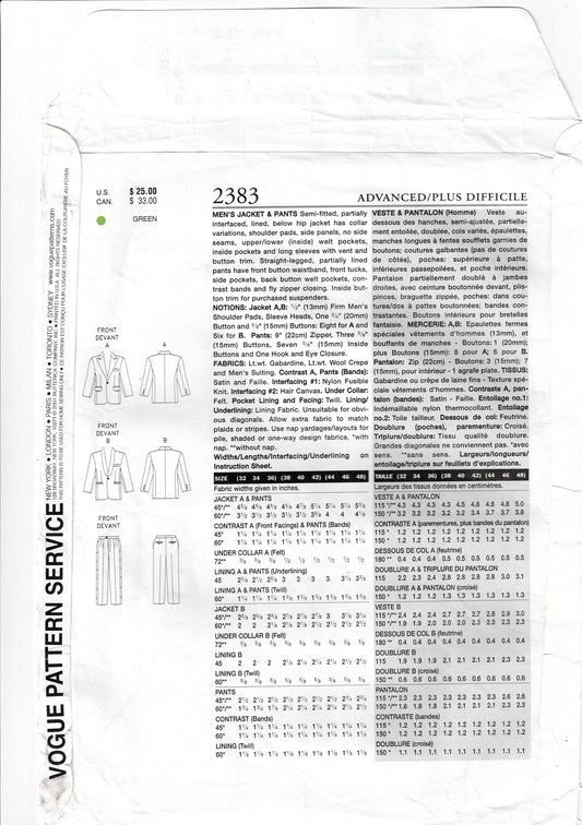 Vogue 2383 Mens Tailored Jacket & Pants Prom Formal Wedding Sewing Pattern Size 32 - 36 UNCUT Factory Folded