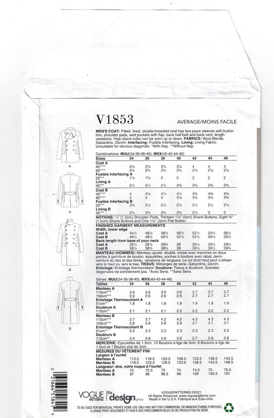 Vogue 1853 Mens Double Breasted Coat Sewing Pattern Size 40 - 46 Inches UNCUT Factory Folded