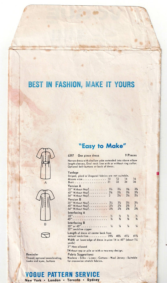 Vogue 6397 Womens Slim Yoked Dress 1960s Vintage Sewing Pattern Size 12 Bust 32 inches UNUSED Factory Folded