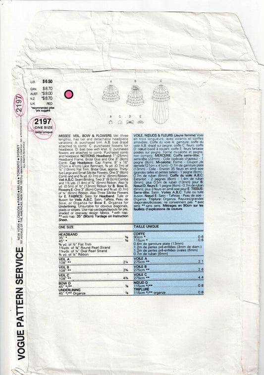 Vogue 2197 Womens Bridal Veils Bow & Flower 1980s Vintage Sewing Pattern ONE SIZE UNCUT Factory Folded
