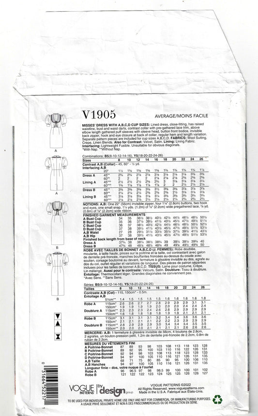 Vogue 1905 Womens High Waisted Puff Sleeved Slim Collared Dress Sewing Pattern Size 18 - 26 UNCUT Factory Folded