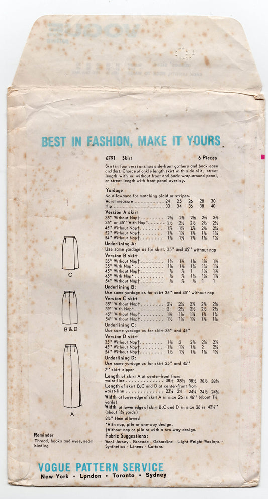 Vogue 6791 Womens Wrap Pencil or Evening Skirts 1960s Vintage Sewing Pattern Waist 28 inches