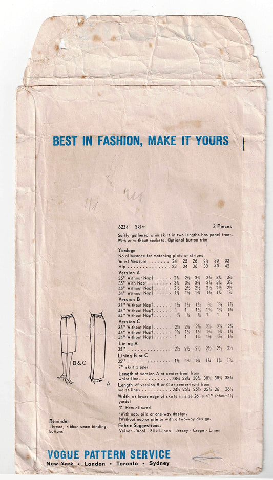 Vogue 6234 Womens Pencil Skirts 1960s Vintage Sewing Pattern Waist 24 inches