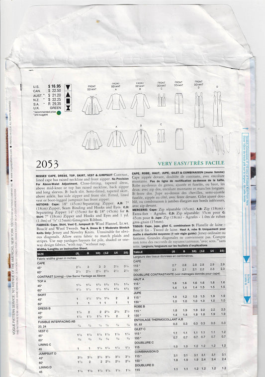 Vogue 2053 FIVE EASY PIECES Womens Cape Dress Top Skirt Vest & Jumpsuit 1990s Vintage Sewing Pattern Size 6 - 10 UNCUT Factory Folded