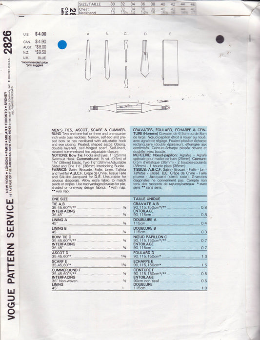 Vogue 2826 Mens Formalwear Accessories Cummerbund Ties Ascot & Scarf 1980s Vintage Sewing Pattern One Size UNCUT Factory Folded