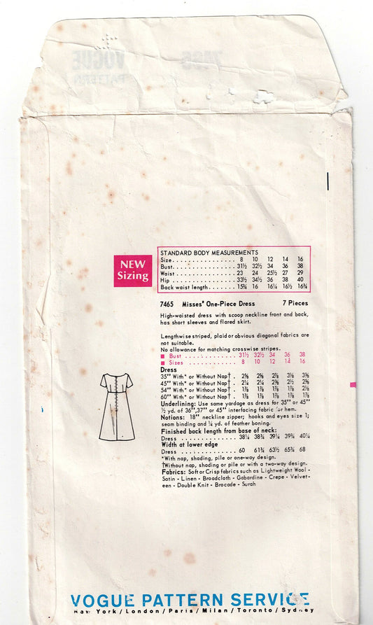 Vogue 7465 RARE Womens Evening High Waisted Tent Dress 1960s Vintage Sewing Pattern Size 12 Bust 34 inches