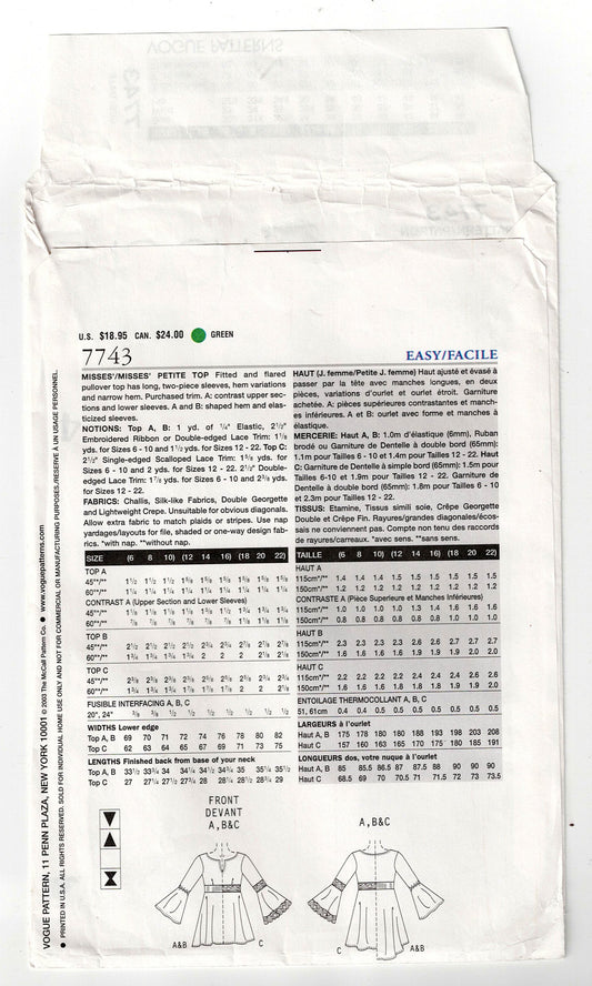 Vogue 7743 Womens Pullover Flared Sleeve Tunic Caftan Tops Out Of Print Sewing Pattern Size 18 - 22 UNCUT Factory Folded