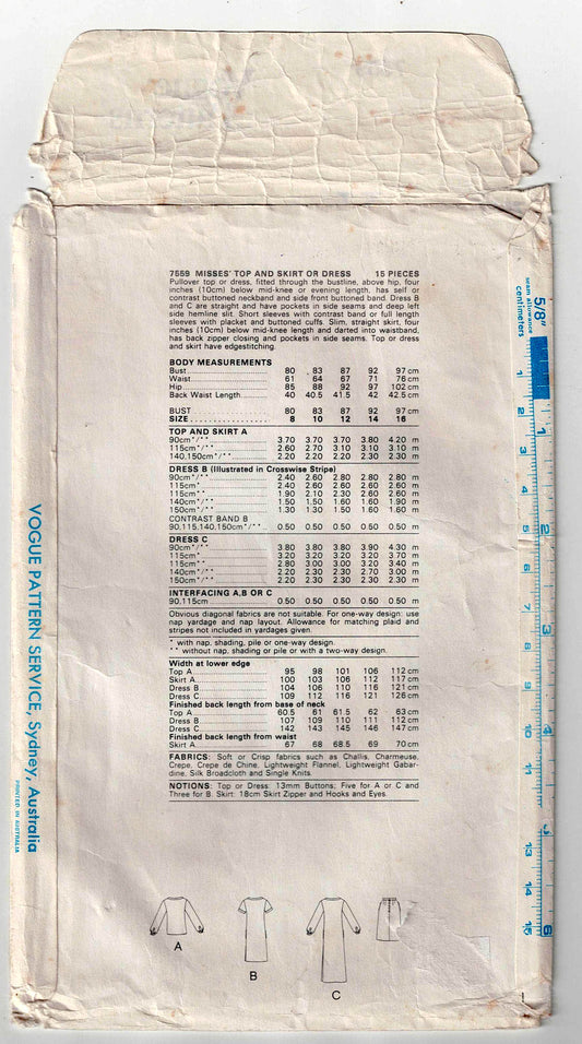 Vogue 7559 Womens Asymmetric Dress or Top & Skirt 1980s Vintage Sewing Pattern Size 12 Bust 34 inches UNCUT Factory Folded