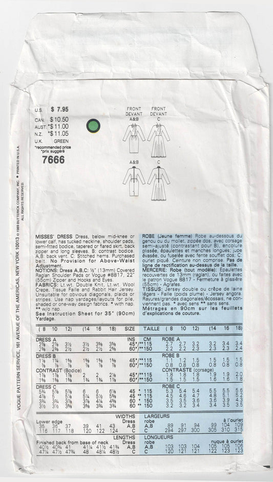 Vogue 7666 Womens Dress with Tucked Neckline 1980s Vintage Sewing Pattern Size 8 - 12 UNCUT Factory Folded