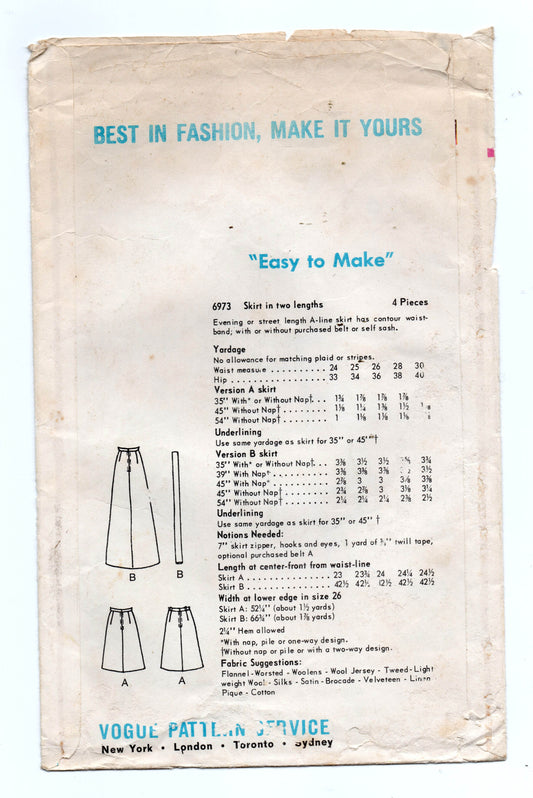 Vogue 6973 Womens EASY A Line Skirts 1960s Vintage Sewing Pattern Waist 28 inches