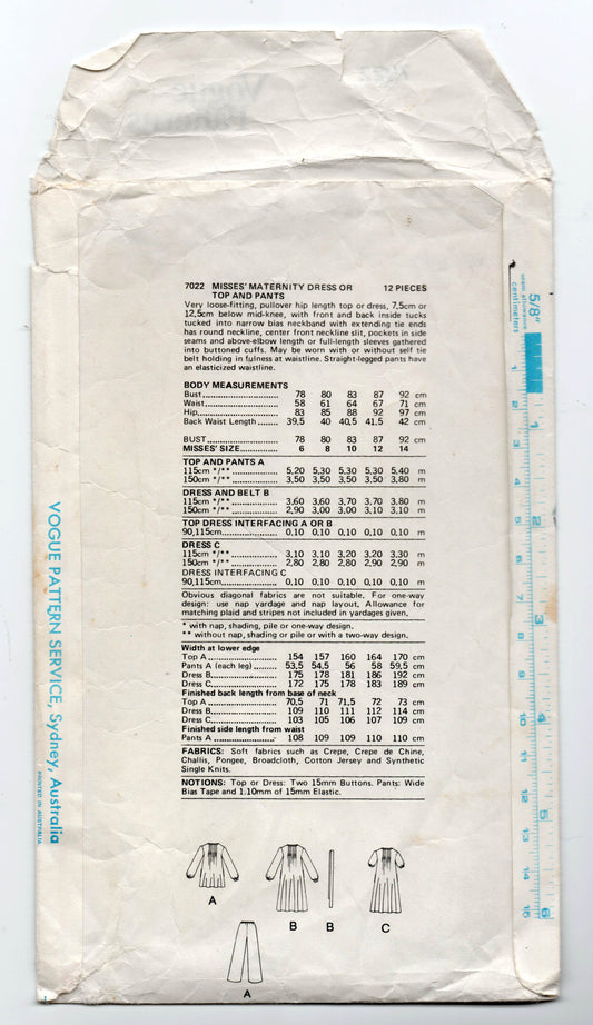 Vogue 7022 Womens Tucked Shoulder Maternity Dress Top & Pants 1970s Vintage Sewing Pattern Size 12 Bust 34 inches
