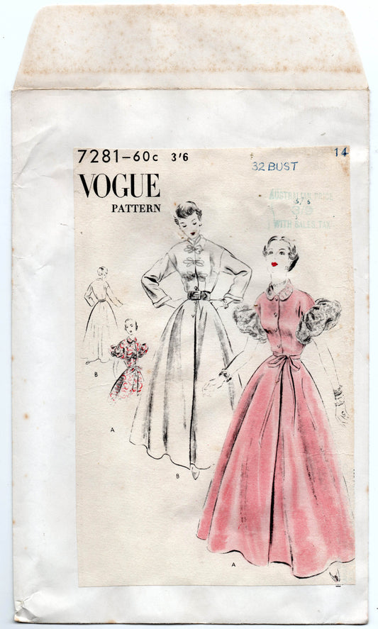 Vogue 7281 RARE Womens Puffy Sleeved Floor Length Lounging Coat 1950s Vintage Sewing Pattern Size 14 Bust 32 inches