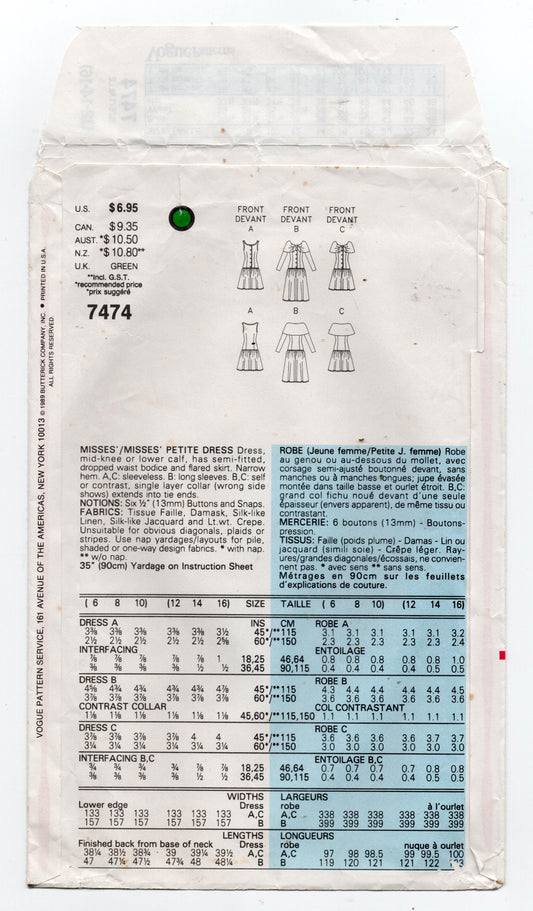 Vogue 7474 Womens Drop Waist Dress with Optional Tie Wide Collar 1980s Vintage Sewing Pattern Size 12 - 16 UNCUT Factory Folded