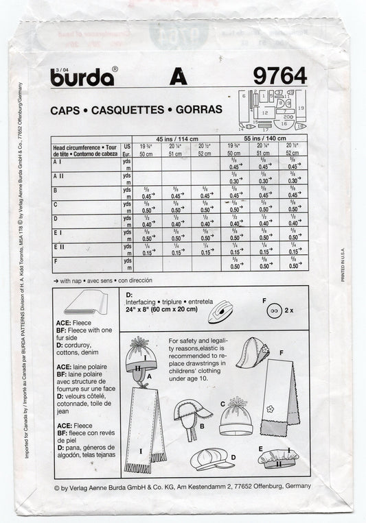 Burda 9764 Childrens Winter Hats & Scarves Out Of Print Sewing Pattern UNCUT Factory folded