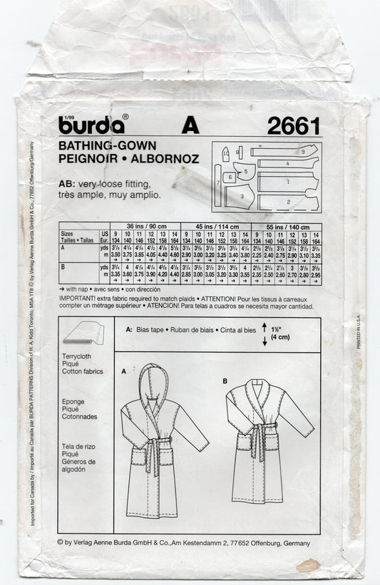 Burda 2661 Boys EASY Wrap Robe Dressing Gown Out Of Print Sewing Pattern Size 9 - 14 UNCUT Factory Folded