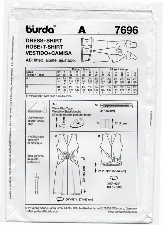 Burda 7696 Womens Stretch Draped Front Dress & Top Out Of Print Sewing Pattern Sizes 6 - 16 UNCUT Factory Folded