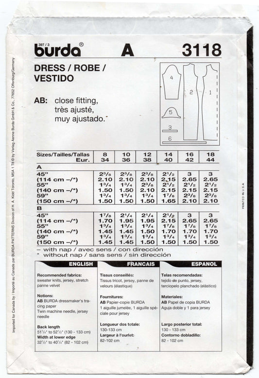 Burda 3118 Womens EASY Stretch T Shirt Dress 1990s Vintage Sewing Pattern Sizes 8 - 18 UNCUT Factory Folded